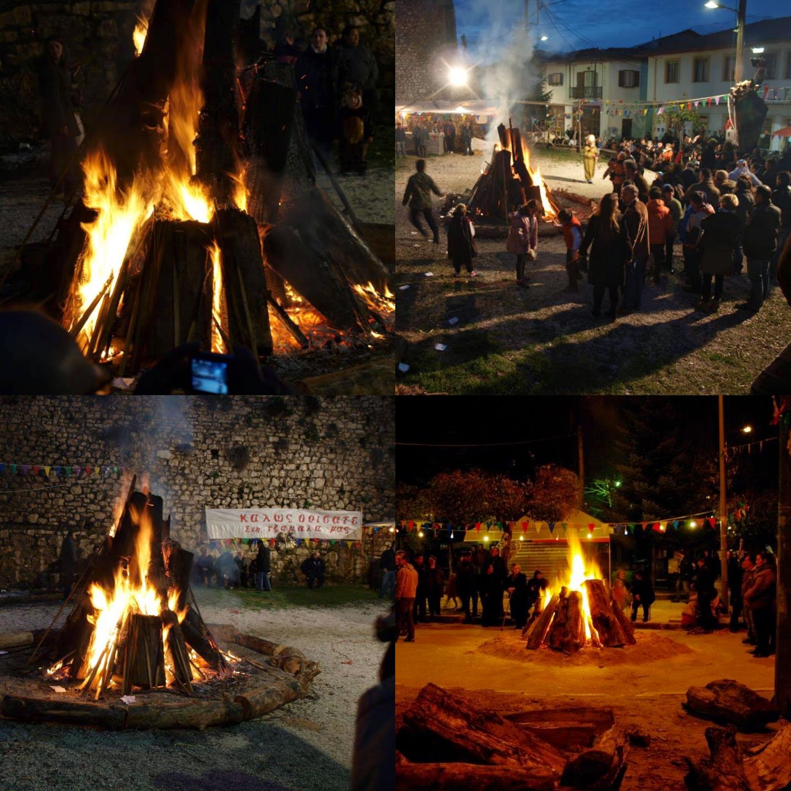 Το χοροστάσι δεν θα διαλυθεί πριν ο ήλιος λάμψει ξανά στον ουρανό.Κάθε φορά που ένα νέο κούτσουρο ρίχνεται στην αδηφάγο μανία της φλόγας, σπίθες υψώνονται στον ουρανό ως το τρίτο πάτωμα γύρω των σπιτιών.Όλα λούζονται σε άπλετο φως. Η μεγάλη φωτιά ζεσταίνει την υγρή νύχτα…Γράφτηκε πως “η ιδέα και η θέα της φωτιάς στα σοκάκια και τους μαχαλάδες της παλιάς μικρής μας πόλης ζέσταινε τις καρδιές και τα κορμιά μικρών και μεγάλων, κάνοντας να αναθαρρεύουν στις εποχές και στις συνήθειές τους”. Κι αυτό είναι αλήθεια.