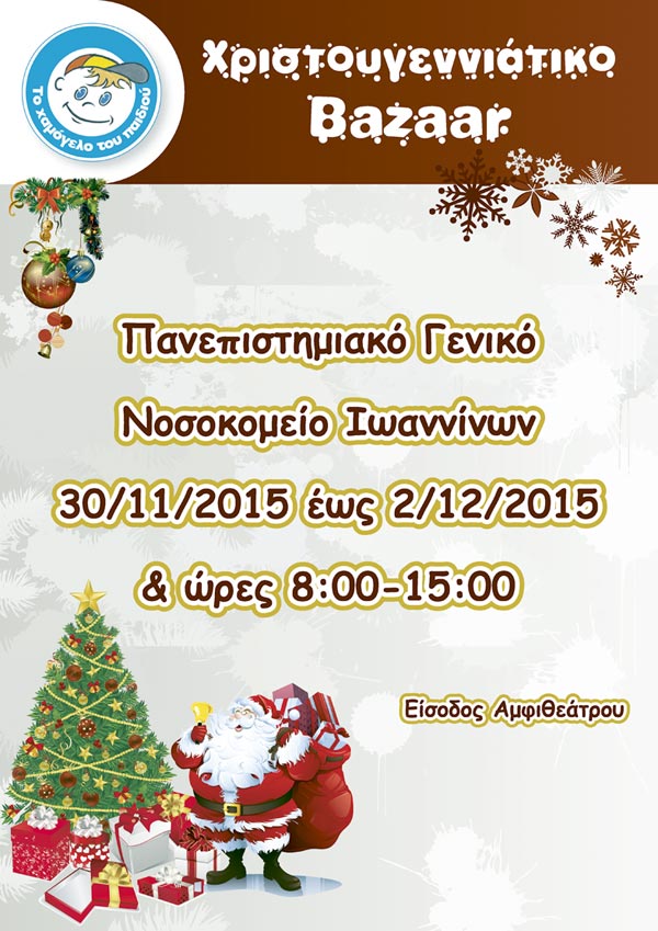 «Το Χαμόγελο του Παιδιού», και φέτος τα Χριστούγεννα, προσκαλεί τους φίλους του για να στηρίξουν το έργο του, να επισκεφτούν τo χριστουγεννιάτικο bazaar που διοργανώνει στο Πανεπιστημιακό Γενικό Νοσοκομείο Ιωαννίνων από σήμερα Δευτέρα έως 2 Δεκεμβρίου.