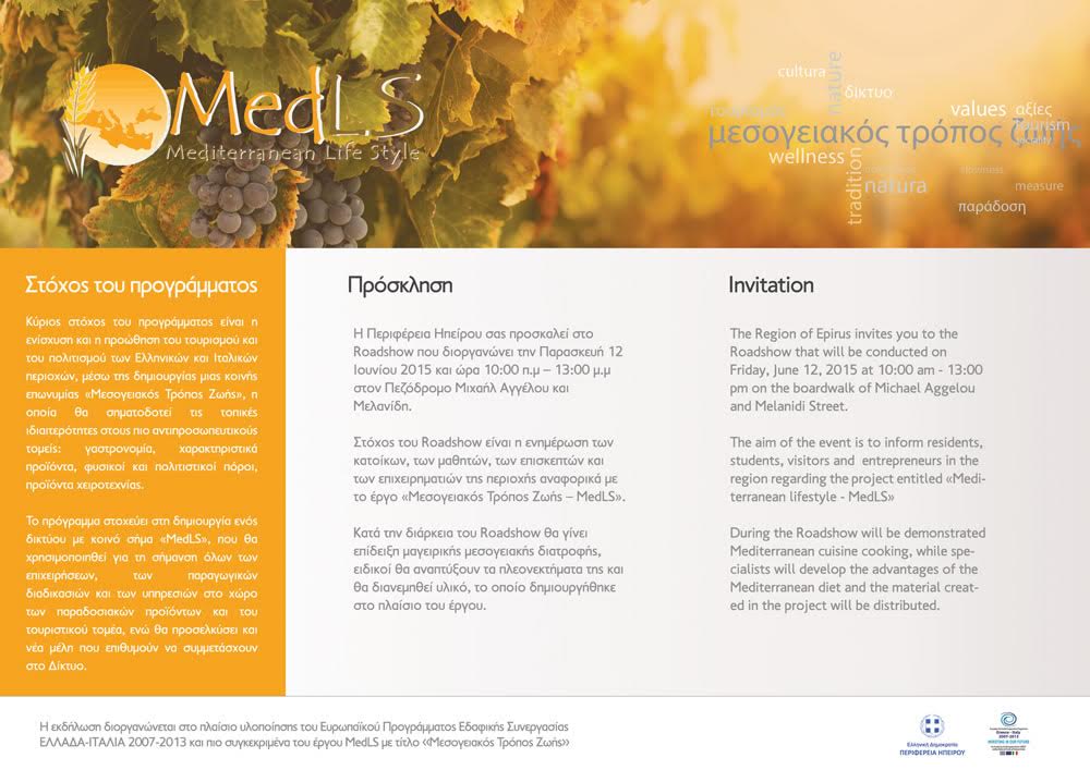 Η Περιφέρεια Ηπείρου σας προσκαλεί στο Roadshow που διοργανώνει την Παρασκευή 12 Ιουνίου 2015 και ώρα 10:00 π.μ – 13:00 μ.μ. στον Πεζόδρομο Μιχαήλ Αγγέλου και Μελανίδη. Στόχος του Roadshow είναι η ενημέρωση των κατοίκων, των μαθητών, των επισκεπτών και των επιχειρηματιών της περιοχής αναφορικά με το έργο «Μεσογειακός Τρόπος Ζωής – MedLS». Κατά την διάρκεια του Roadshow θα γίνει επίδειξη μαγειρικής μεσογειακής διατροφής, ειδικοί θα αναπτύξουν τα πλεονεκτήματα της και θα διανεμηθεί υλικό, το οποίο δημιουργήθηκε στo πλαίσιο του έργου.