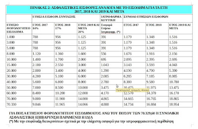 Ας πάρουμε για πάράδειγμα έναν αγρότη με ετήσιο φορολογητέο εισόδημα 40.000 €. Με το νέο ασφαλιστικό, οι εισφορές για ασφάλιση, περίθαλψη και Αγροτική Εστία, θα διαµορφωθούν στις 10.890 ευρώ (20% επί φορολογητέου, µετά το 2019) πράγµα που σηµαίνει ότι από το εναποµείναν (29.110 ευρώ) θα πρέπει να αφαιρεθεί φόρος 26%, δηλαδή 7.569 ευρώ, τουτέστιν θα του µείνουν 21.541 ευρώ.