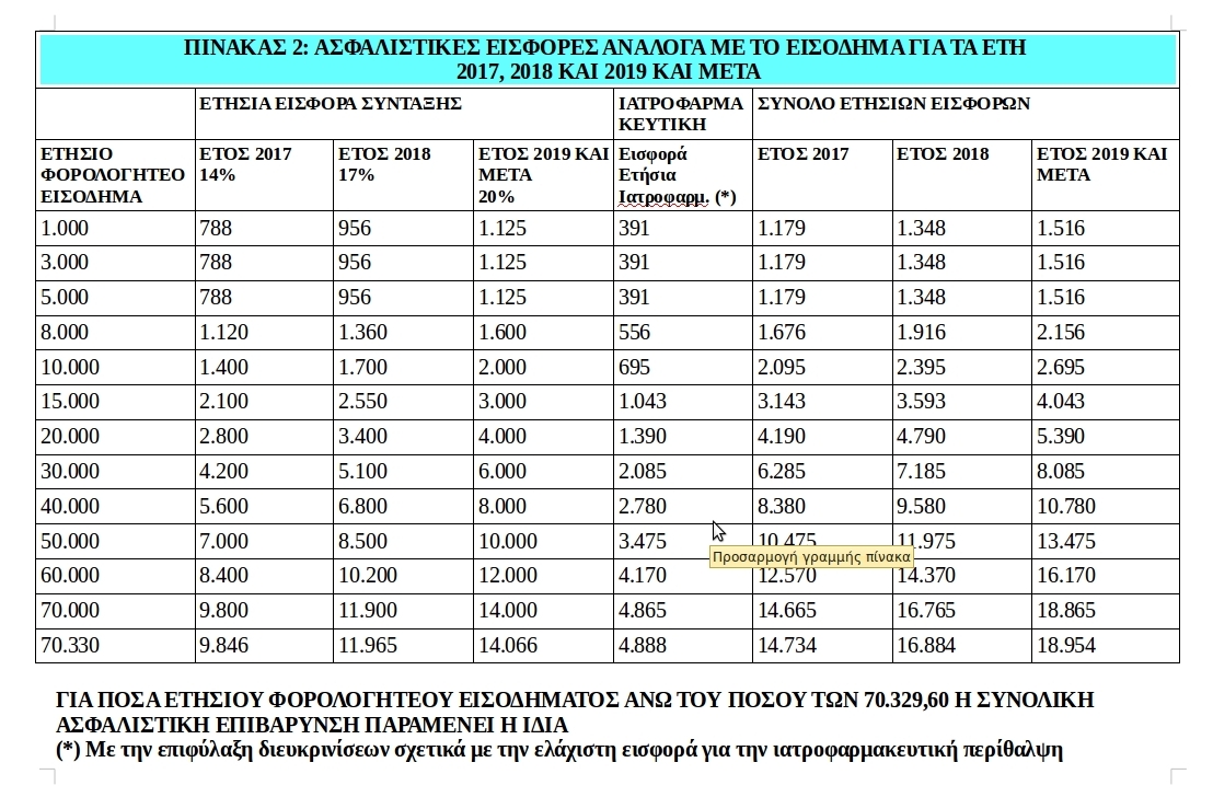 Ας πάρουμε για πάράδειγμα έναν αγρότη με ετήσιο φορολογητέο εισόδημα 40.000 €. Με το νέο ασφαλιστικό, οι εισφορές για ασφάλιση, περίθαλψη και Αγροτική Εστία, θα διαµορφωθούν στις 10.890 ευρώ (20% επί φορολογητέου, µετά το 2019) πράγµα που σηµαίνει ότι από το εναποµείναν (29.110 ευρώ) θα πρέπει να αφαιρεθεί φόρος 26%, δηλαδή 7.569 ευρώ, τουτέστιν θα του µείνουν 21.541 ευρώ.